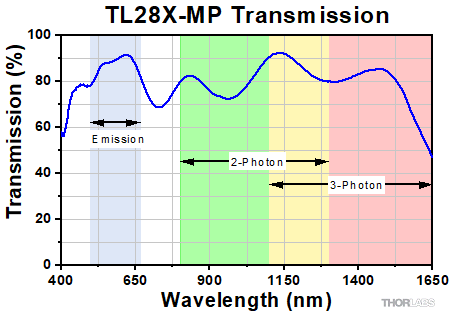 The TL10X-2P Super Apochromatic and TL15X-2P Plan Apochromatic Improved Visible (APO VIS+) Objectives combine the diffraction limited axial color performance at visible wavelengths of our other objectives with excellent transmission out to 1300 nm, making these objectives ideal for multiphoton imaging applications (see the Graphs tab for details). The TL28X-MP Plan Apochromatic objective is optimized in the NIR, with diffraction limited performance from 900 -1650 nm, making it another great choice for multiphoton microscopy, including with 3-photon excitation. For more information about how these objective classes are defined, see the Objective Tutorial tab.