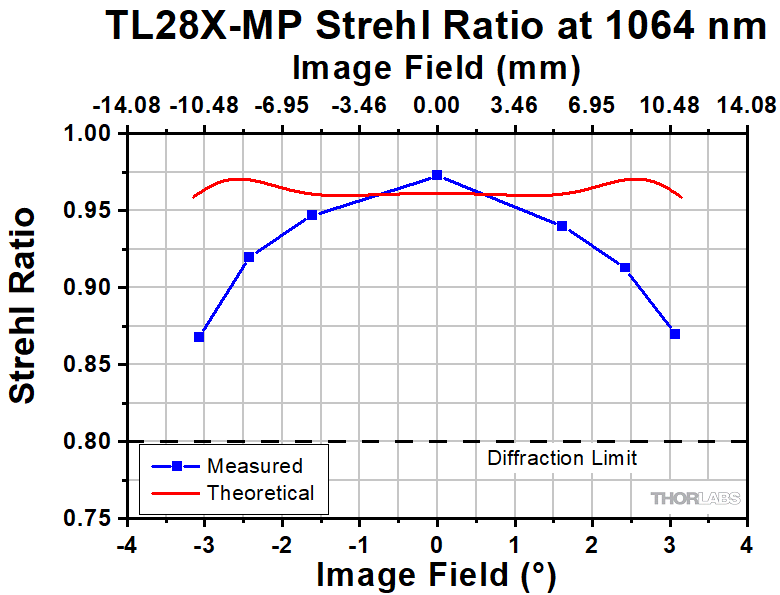 The Strehl Ratio is a quantitative measurement of optical image formation quality. The Strehl Ratio for the TL2X-SAP over its field of view is shown in the graph above.