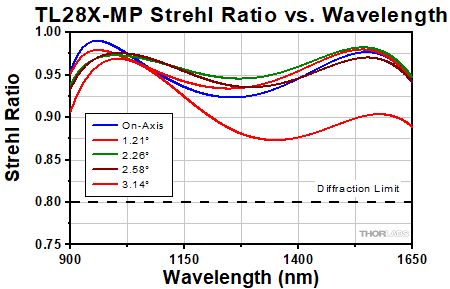 This graph shows the Strehl Ratio of the TL1X-SAP over the objective's full operating wavelength range.