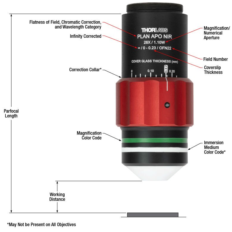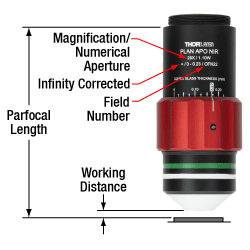 Figure 1.1 Thorlabs maintains the labeling convention shown here for our TL15X-2P and TL28X-MP objectives. (See the Objective Tutorial tab for more information about microscope objective types and labeling schemes.)
