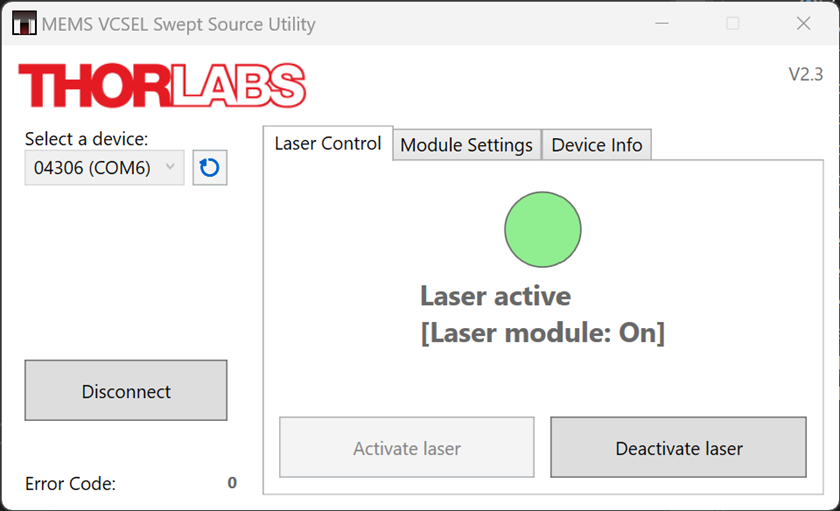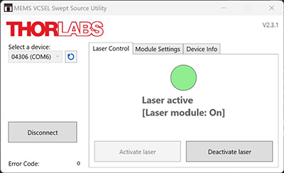 MEMS-VCSEL Swept Source UtilityThe MEMS-VCSEL Swept Source Utility software package is a graphical user interface (GUI) that provides full control of the MEMS-VCSEL laser sources. The GUI allows remote activation and full control of the module settings.